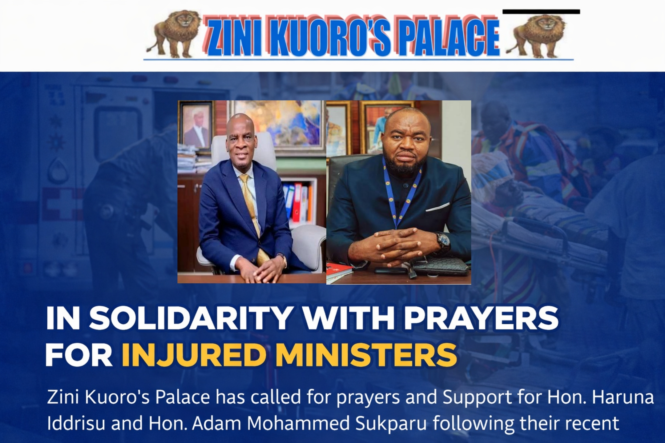 The Zini Kuoro’s Palace has publicly expressed its heartfelt concern and prayers for the recovery of the Minister for Education, Hon. Haruna Iddrisu, and the Deputy Minister for Communication, Digital Technology and Innovation, Hon. Adam Mohammed Sukparu, following the road accident that involved them earlier this month. In a statement issued on February 20, 2026,…