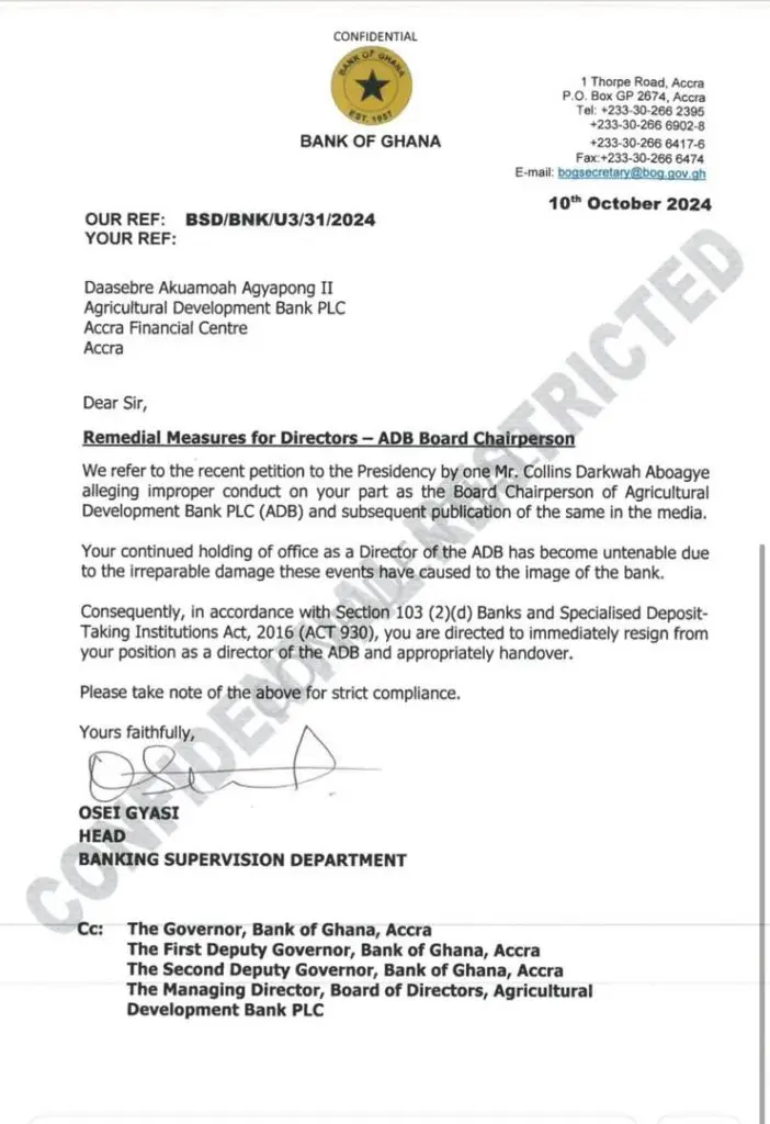 It said, “In accordance with Section 103 (2)(d) Banks and Specialised Deposit-Taking Institutions Act, 2016 (ACT 930), you are directed to immediately resign from your position as a director of the ADB and appropriately handover.”