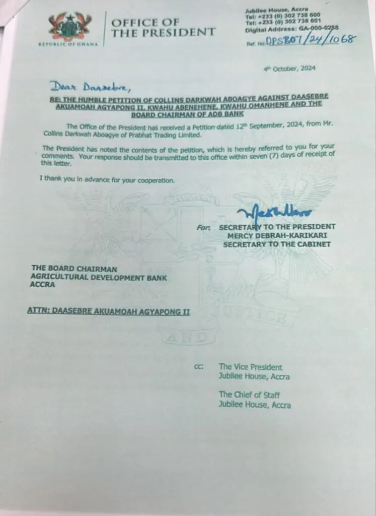 The businessman, Collins Darkwah Aboagye, a Director and shareholder of PRABHAT Trading Limited in the petition dated September 12, 2024, and cited by Myjoyonline.com, said the Board Chair of the state-owned Agricultural Development Bank (ADB used his influence to help him secure a loan from the Agricultural Development Bank after he had struggled to get it by himself.