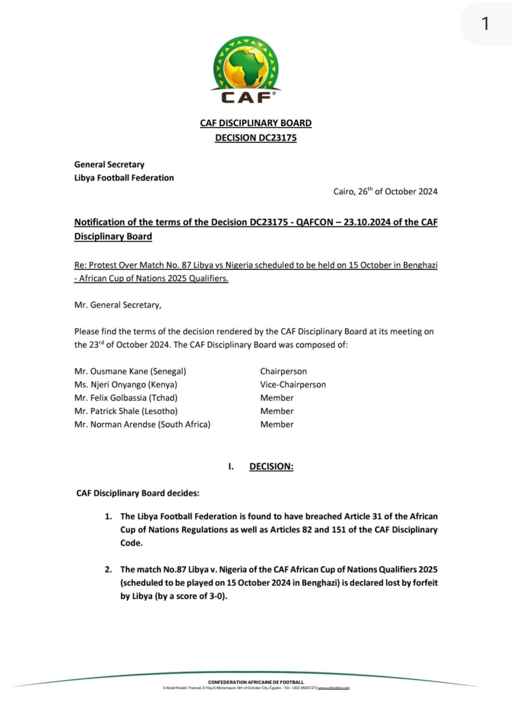Additionally, Libya’s scheduled Africa Cup of Nations (AFCON) qualifier against Nigeria has been cancelled, with CAF awarding Nigeria a 3-0 win by default.