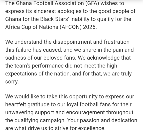 The Ghana Football Association (GFA) has apologised to Ghanaians following the Black Stars’ failure to qualify for the 2025 Africa Cup of Nations (AFCON).