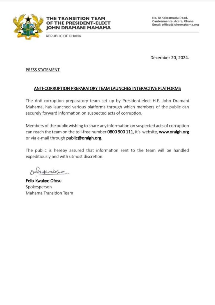 President-elect John Mahama’s Transition Team has launched secure platforms for public reporting of corruption, reinforcing transparency in governance. The Anti-Corruption Preparatory Team, established by President-elect John Dramani Mahama, has unveiled new interactive platforms aimed at tackling corruption.