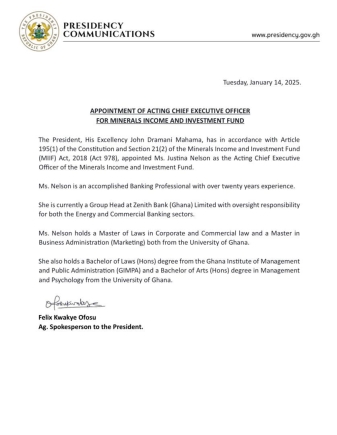 President John Dramani Mahama has appointed Ms Justina Nelson as the acting Chief Executive Officer (CEO) of the Minerals Income and Investment Fund (MIIF) following the removal of Edward Nana Yaw Koranteng on Tuesday morning.