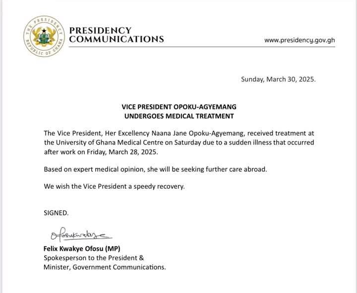 Vice President Naana Jane Opoku-Agyemang has received medical treatment at the University of Ghana Medical Centre (UGMC) after suffering a sudden illness on Friday, 28th March 2025.