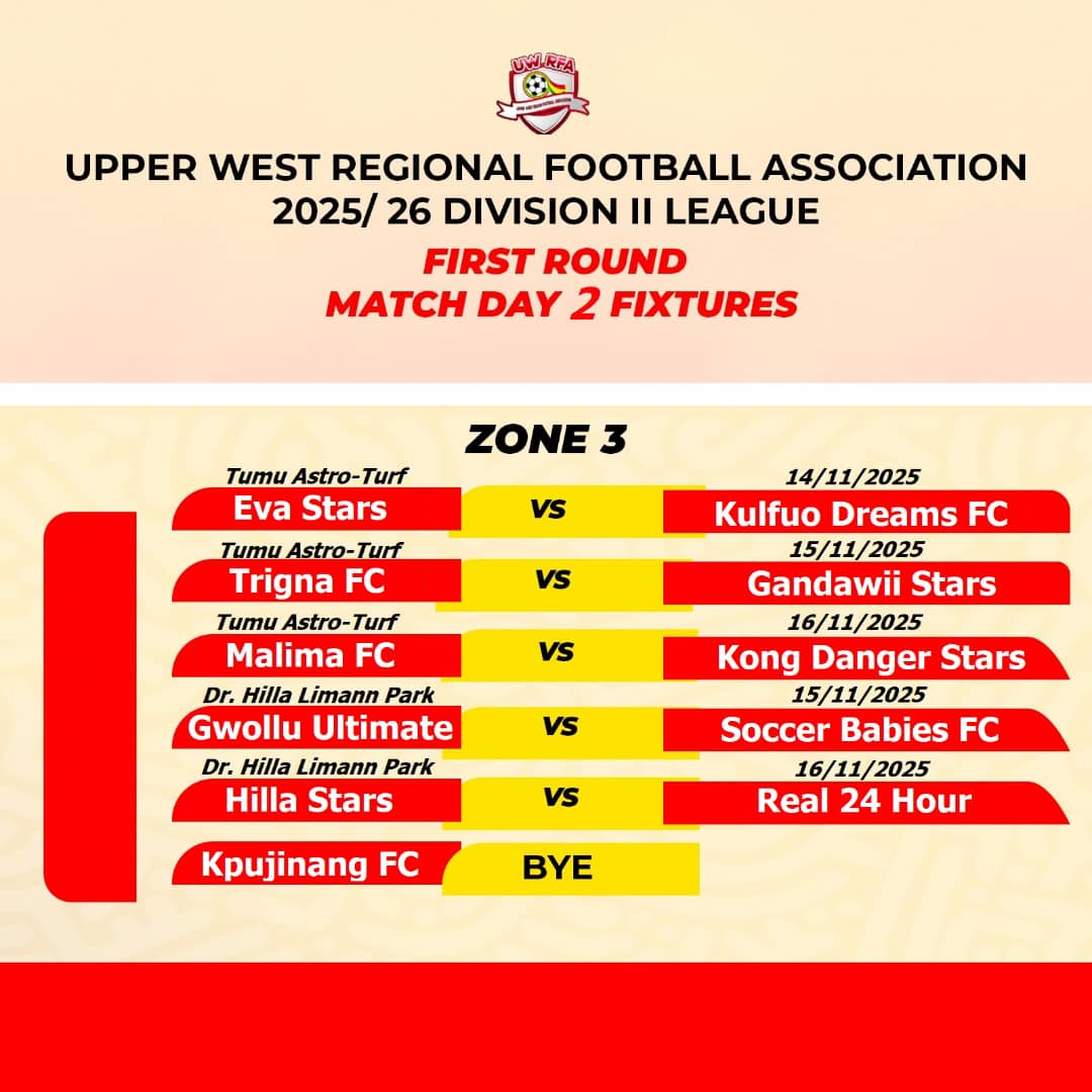 Sunday, November 16, 2025, sees Malima FC lock horns with Kong Danger Stars FC at the Tumu Astro Turf.
